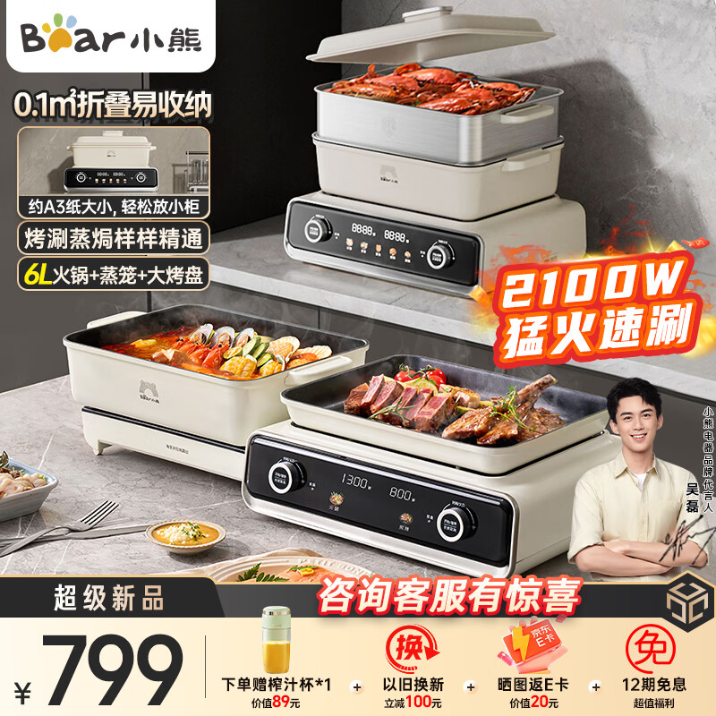 小熊(Bear)叠叠锅 折叠多功能锅 电火锅专用锅家用蒸烤涮一体料理锅烤肉锅烧烤炉 DKL-N21P2 6L分体式价格:799.00元!
