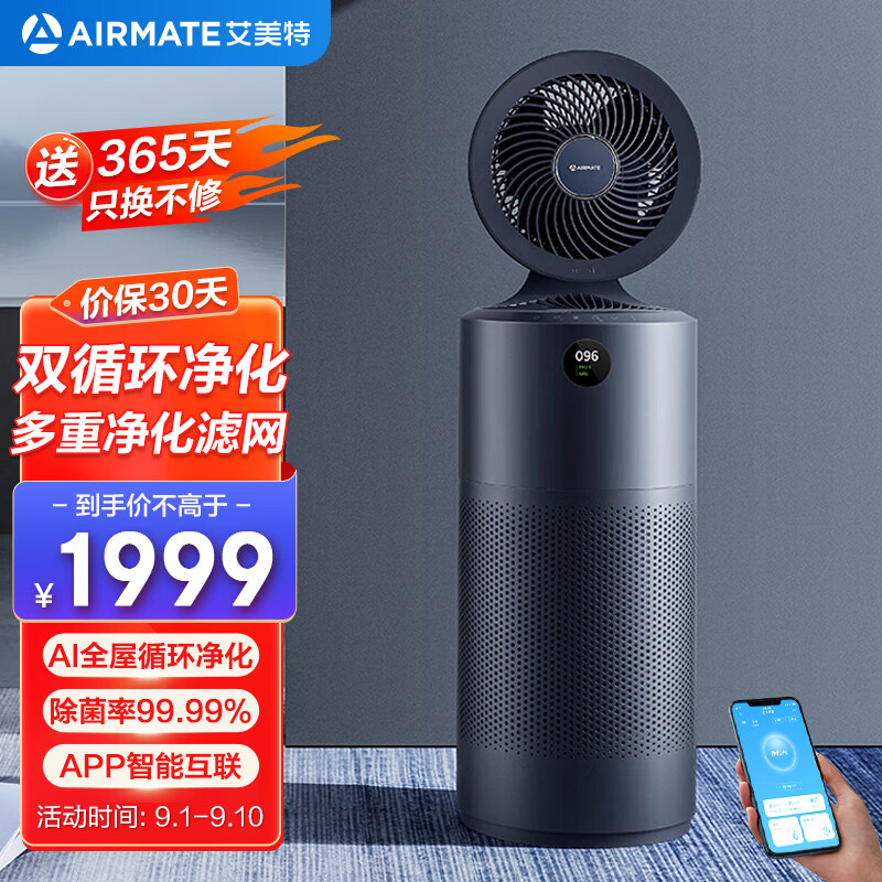 艾美特(AIRMATE)负离子净化空气循环扇智能全屋家用空气净化器直流变频低噪轻音落地扇四季适用电风扇 AIR7 PRO价格:2499.00元!