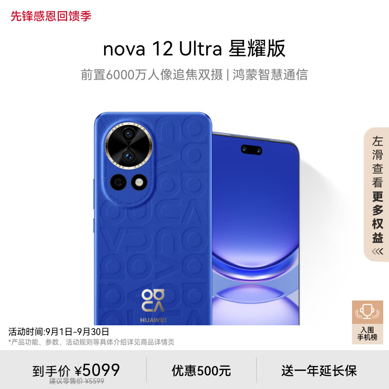 HUAWEI nova 12 Ultra 星耀版 前置6000万人像追焦双摄 1TB 12号色 鸿蒙智慧通信华为智能手机价格:5099.00元!