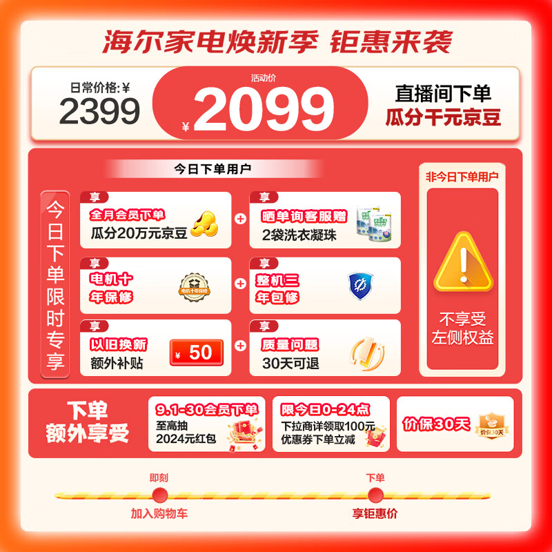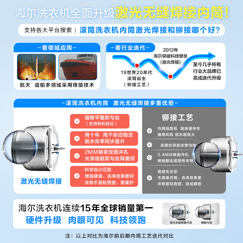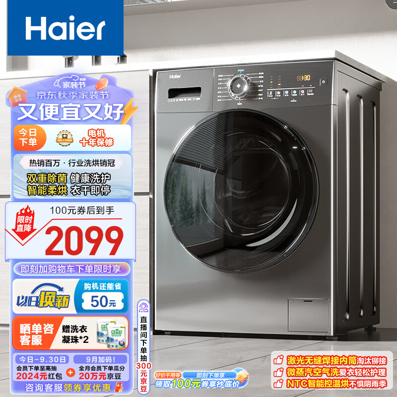 海尔(Haier)滚筒洗衣机全自动 洗烘一体机带烘干 超薄家用 10公斤大容量 EG100HMATE28S 以旧换新 一级能效价格:2099.00元!