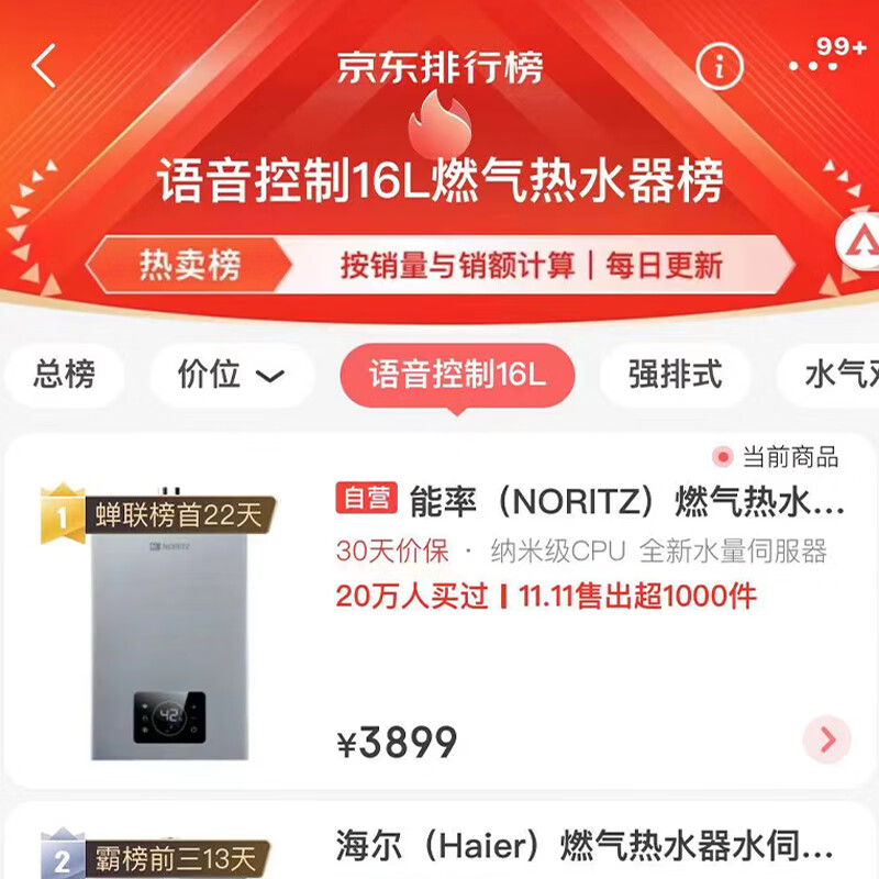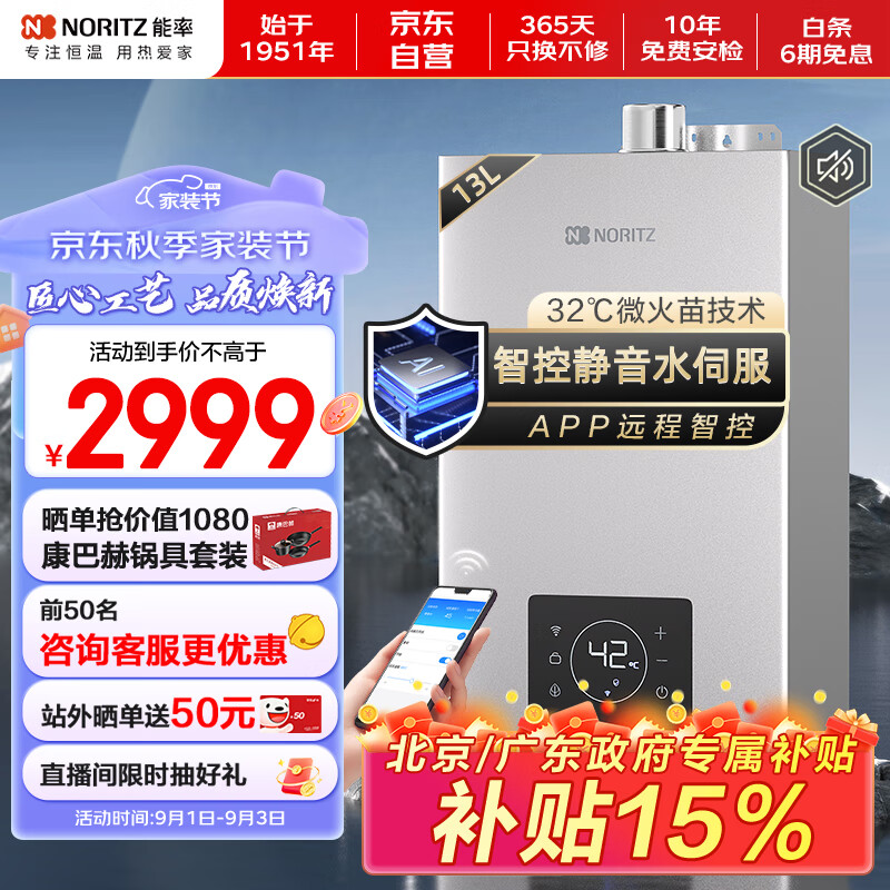 能率(NORITZ)13升燃气热水器天然气 APP智控节能静音水伺服 下置风机 澎湃速热大水量 GQ-13V36AFEX 以旧换新价格:2999.00元!