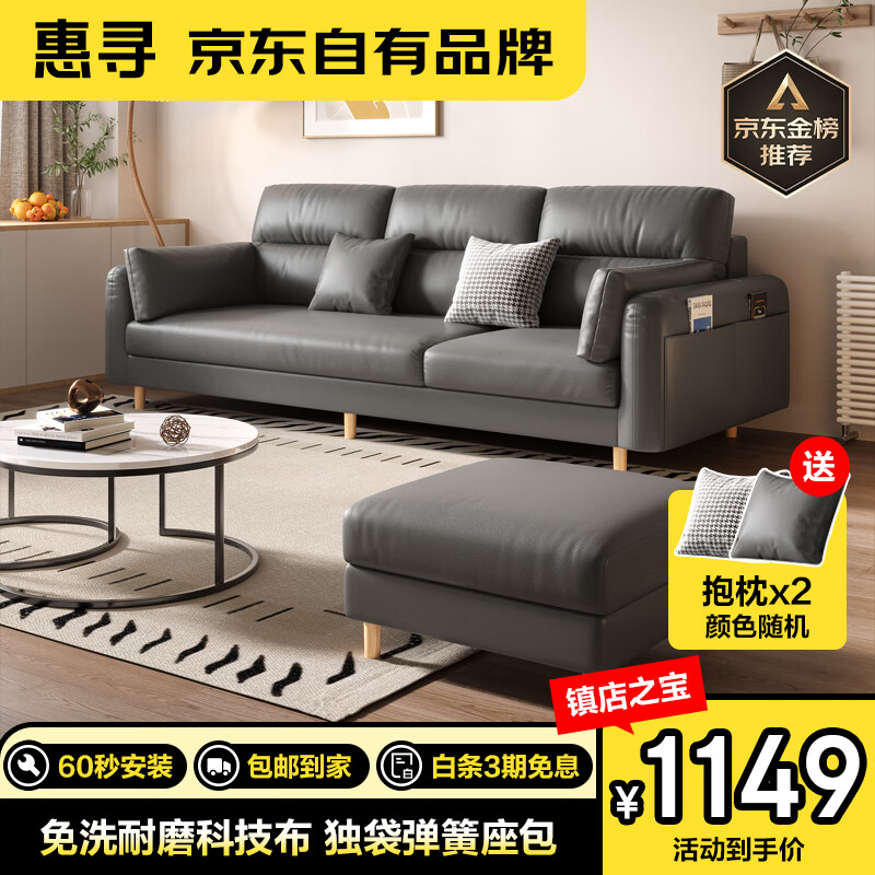 惠寻 京东自有品牌 科技布艺沙发客厅小户型直排三人位2.1米+贵妃榻价格:1179.00元!