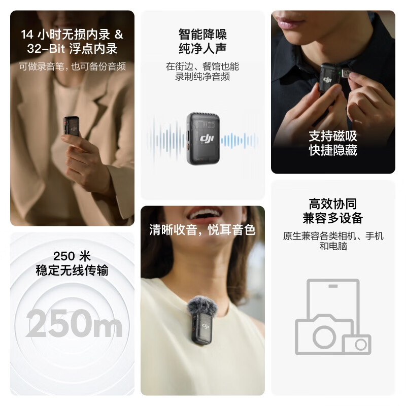 大疆DJI Mic 2(一发一收) 专业音质无线麦克风 直播降噪收音麦 手机相机收音器蓝牙一拖一领夹麦价格:1499.00元!