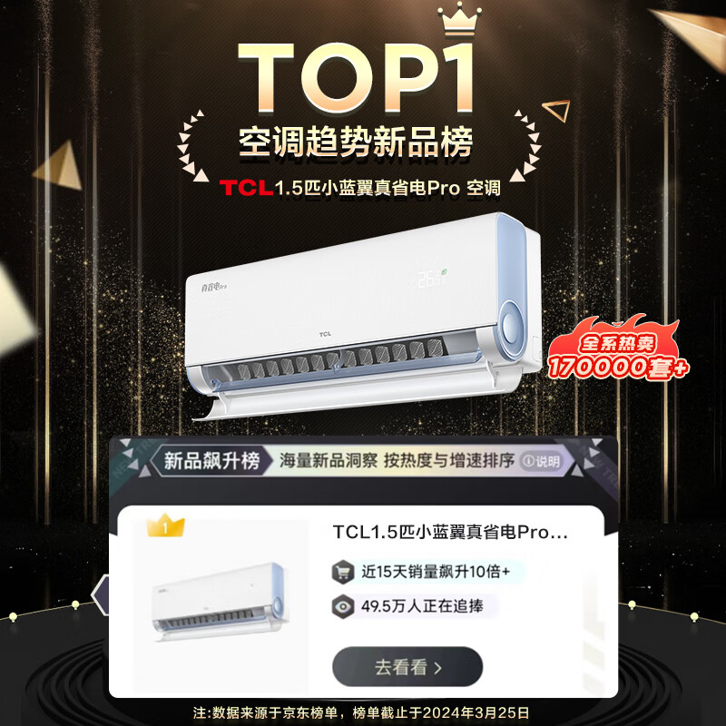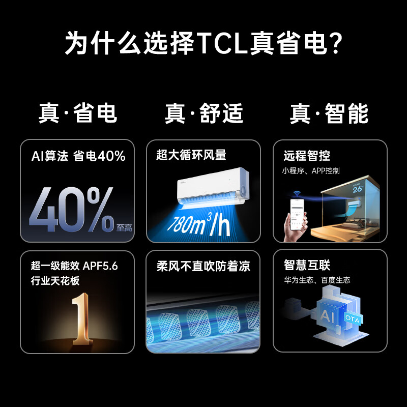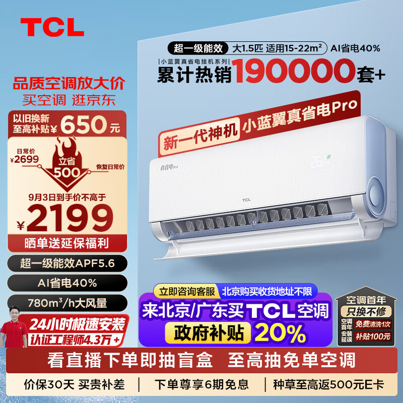 TCL空调1.5匹 小蓝翼真省电Pro 空调挂机 超一级能效省电40% 变频冷暖 卧室挂机KFR-35GW/RT2Ea+B1价格:2199.00元!