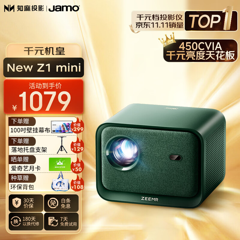 知麻New Z1 mini 2023款 投影仪家用 投影机卧室客厅 智能家庭影院芝麻(450 CVIA流明 全自动校正 全域清晰)价格:1099.00元!