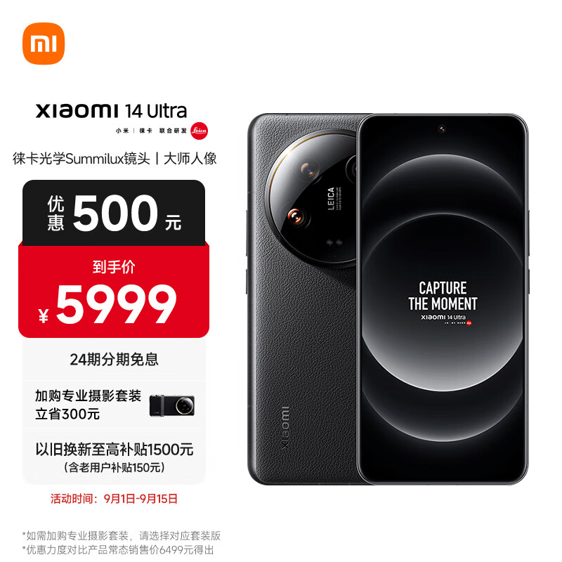 小米Xiaomi 14Ultra 徕卡光学Summilux镜头 大师人像 双向卫星通信 第三代骁龙8 12+256 黑色 5g手机价格:5999.00元!