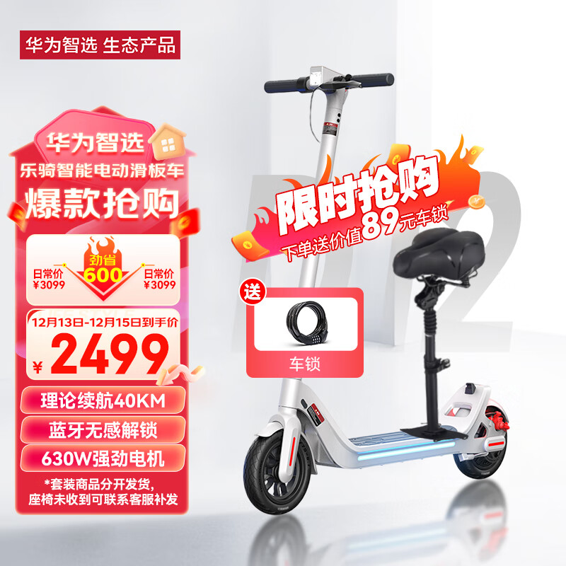 华为智选 乐骑智能电动滑板车成人学生体感车便携可折叠电动车 真空胎 定速巡航一键解锁 哑光白价格:2499.00元!