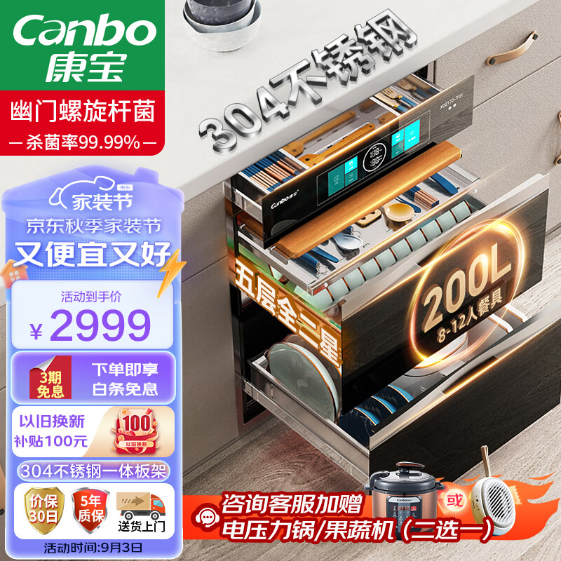 康宝(Canbo)304不锈钢200L五层 消毒柜 嵌入式 家用大升数紫外线厨房餐具碗筷奶瓶二星消毒碗柜XDZ200-TQ1蓝鲸价格:2999.00元!