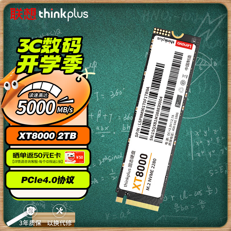 ThinkPlus联想 2TB SSD固态硬盘m.2接口(NVMe协议)pcie4.0 XT8000系列 读速高达5000MB/s价格:869.00元!