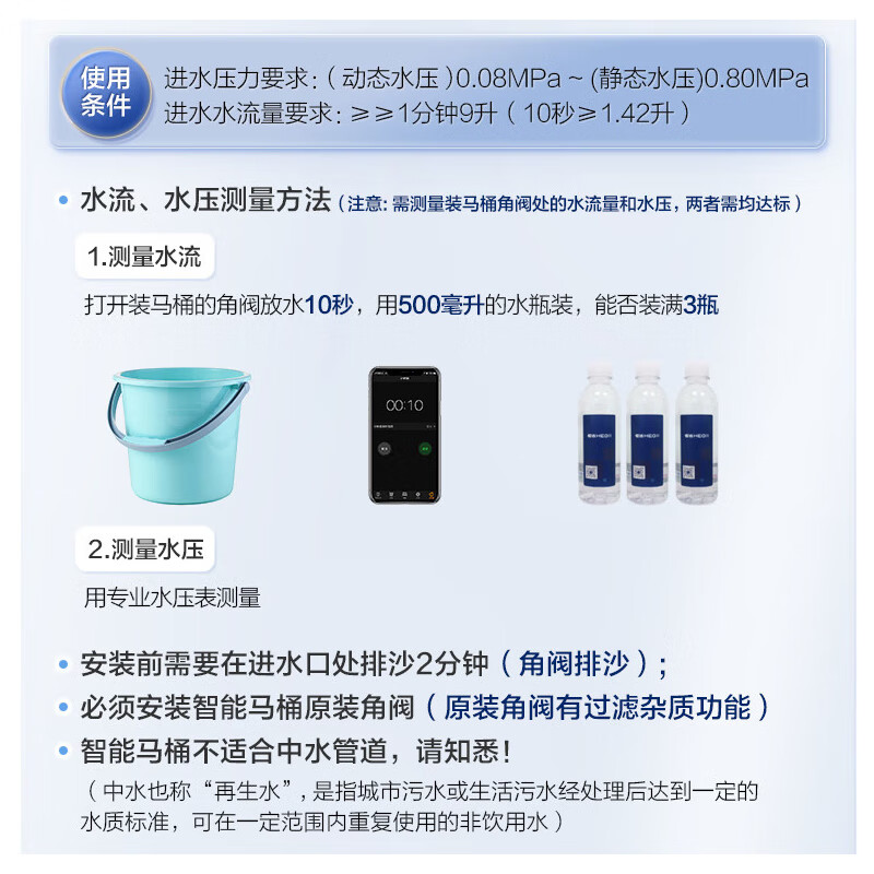 4、新房装修,买了两台。颜值挺高的,好看,很好用,冲水有劲自带水箱和泵压。自发电大按钮,有小冲和大冲,快捷易用。自带的三通角阀还有过滤功能,能过滤铁锈泥沙。