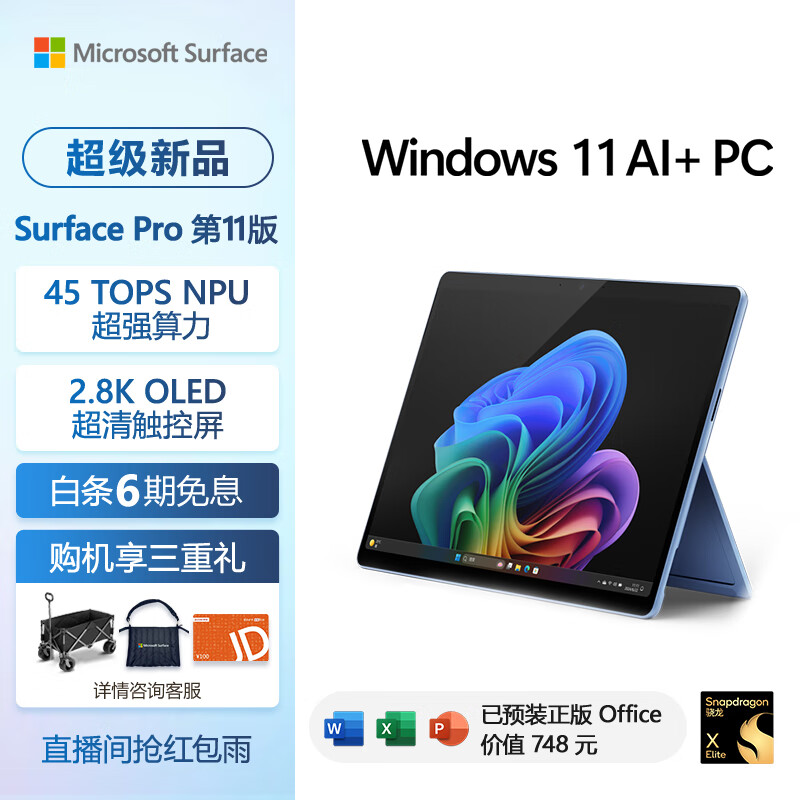 微软(Microsoft)全新Surface Pro第11版 骁龙X Elite 16G 512G 宝石蓝二合一平板笔记本电脑 学生平板 AIPC Pro 11价格:11088.00元!