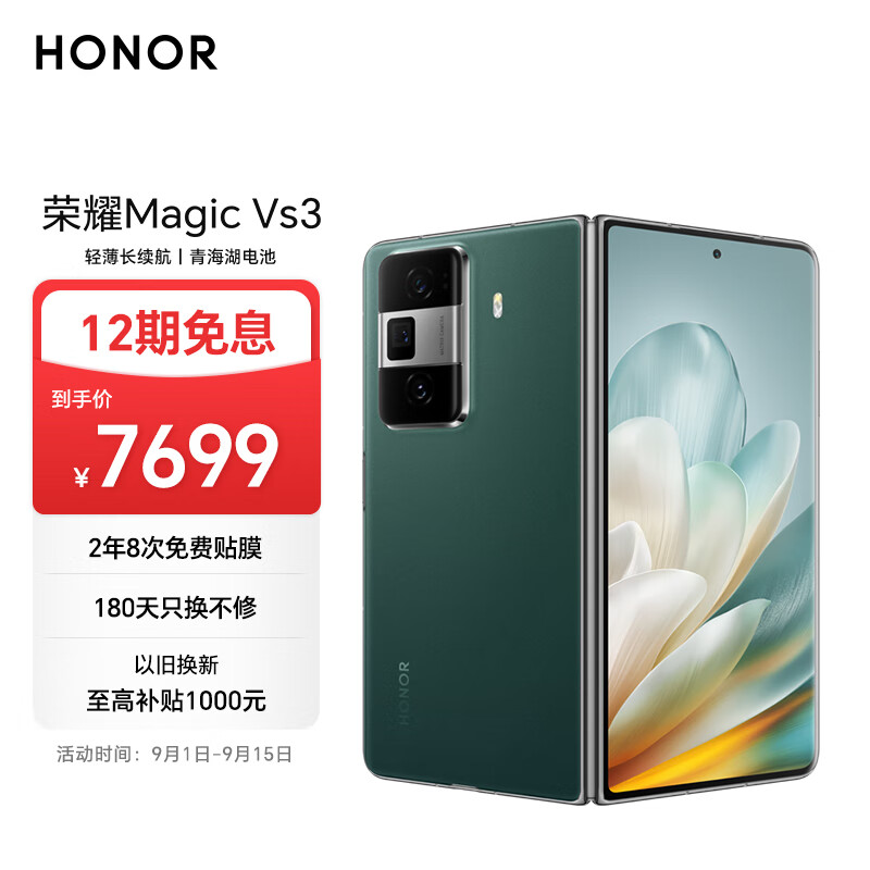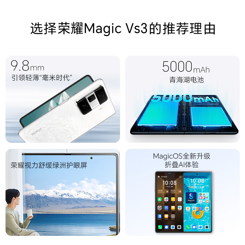 荣耀Magic Vs3 新款折叠屏 轻薄长续航 青海湖电池 荣耀绿洲护眼屏 12+512 苔原绿 拍照 5G AI智能手机价格:7699.00元!