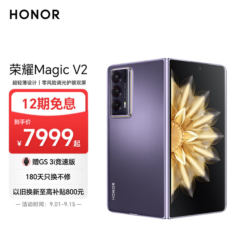 荣耀Magic V2 折叠屏 超轻薄设计 零风险调光护眼双屏 骁龙8Gen2版 16+256 绒紫色 5G AI智能手机价格:7999.00元!