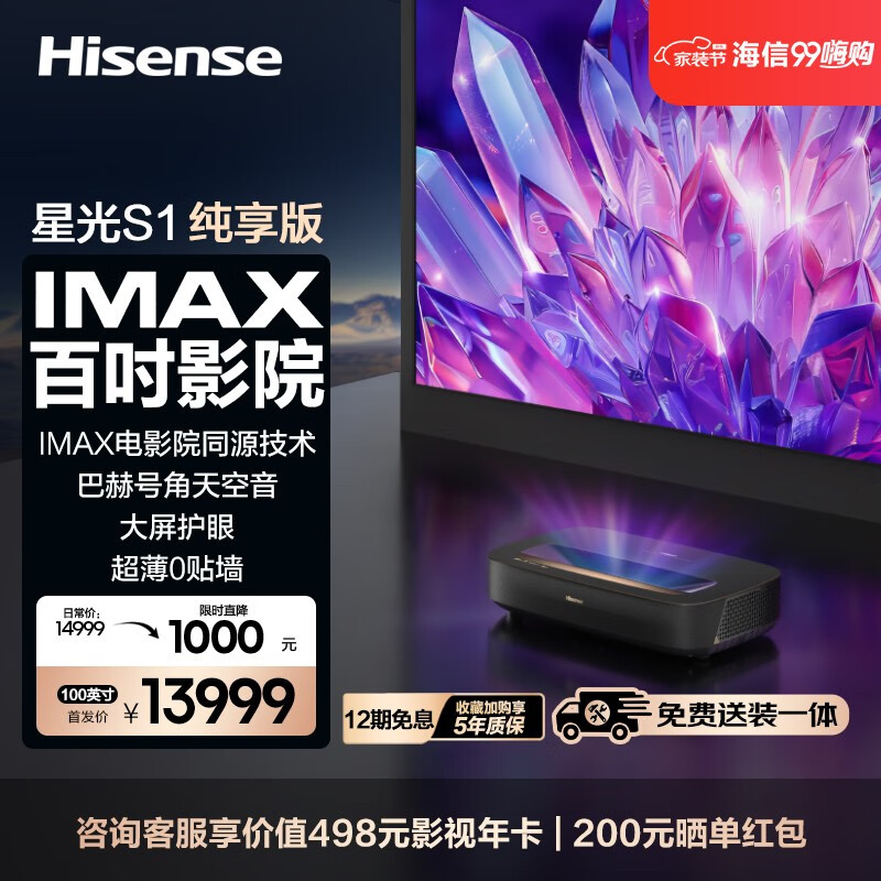 海信激光电视 星光S1 纯享版 100英寸 4K超高清家庭影院 大屏护眼 电影院同源技术 超薄巨幕黑神话悟空价格:13999.00元!