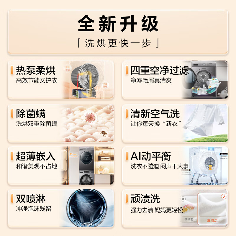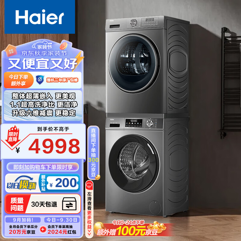 海尔(Haier)超薄全嵌洗烘套装 10KG滚筒洗衣机全自动+热泵烘干机家用 1.1洗净比 MATE29S+HG100-16 以旧换新价格:4998.00元!