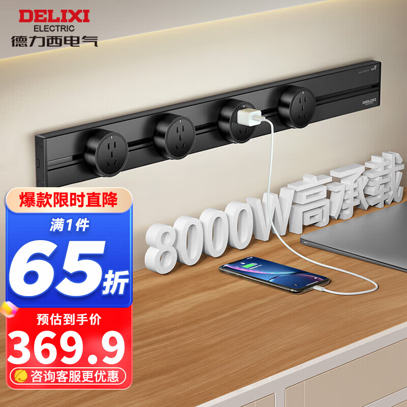 德力西(DELIXI)轨道插座 可移动插座壁挂式滑轨插座80厘米+4个五孔插座 黑色价格:569.00元!