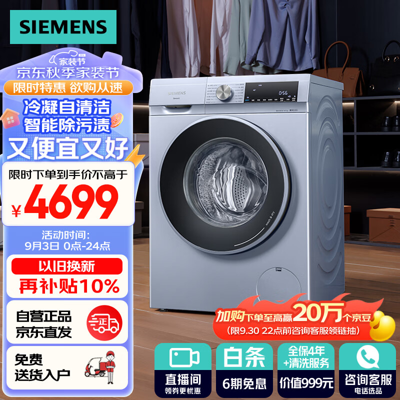 西门子(SIEMENS)10公斤滚筒洗衣机全自动带烘干 洗烘一体 智能除渍 蒸气除螨 冷凝自清洁 智能烘干 WN54A2X40W价格:4699.00元!