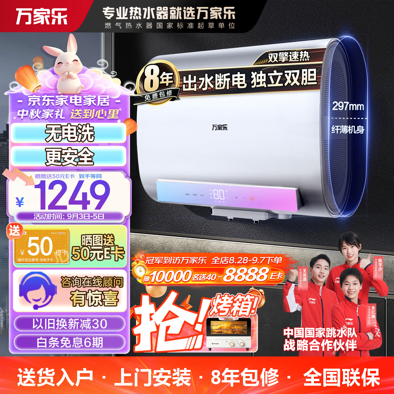 万家乐60升电热水器双胆扁桶3000W速热 家用储水式 出水断电 手机智控 智能杀菌D60-FB2 以旧换新价格:1399.00元!