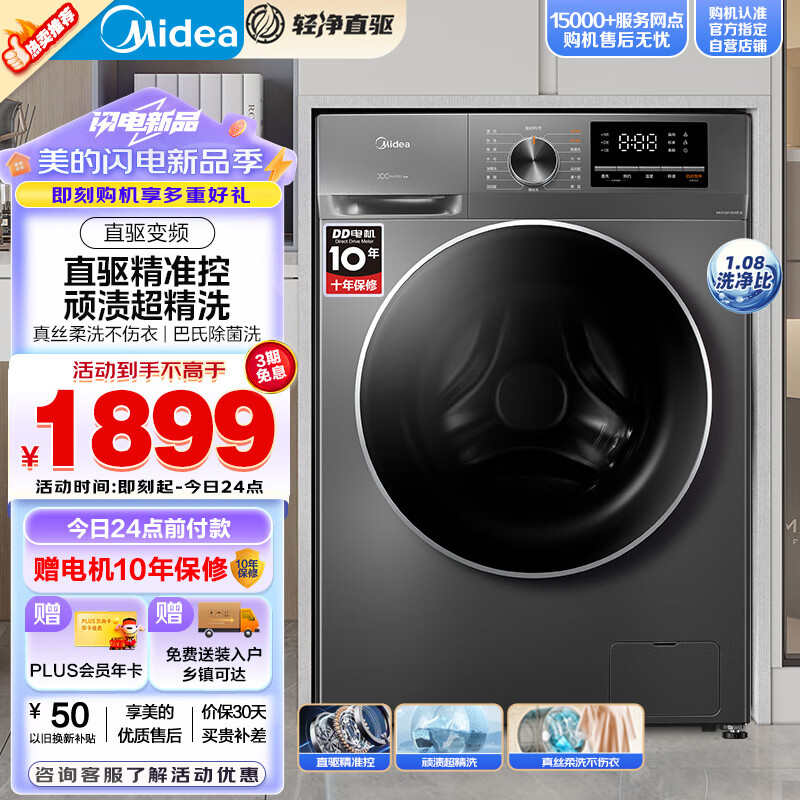 美的(Midea)滚筒洗衣机全自动 轻净直驱系列 直驱变频 顽渍超精洗 1.08洗净比 全域除菌螨 10公斤 MG100V630DE价格:1899.00元!