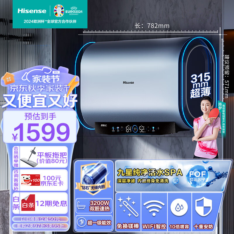 海信(Hisense)纤薄扁桶60升家用电热水器超薄双胆3200W速热电子镁棒一级能效10倍增容WIFI智能S7210i以旧换新价格:1699.00元!