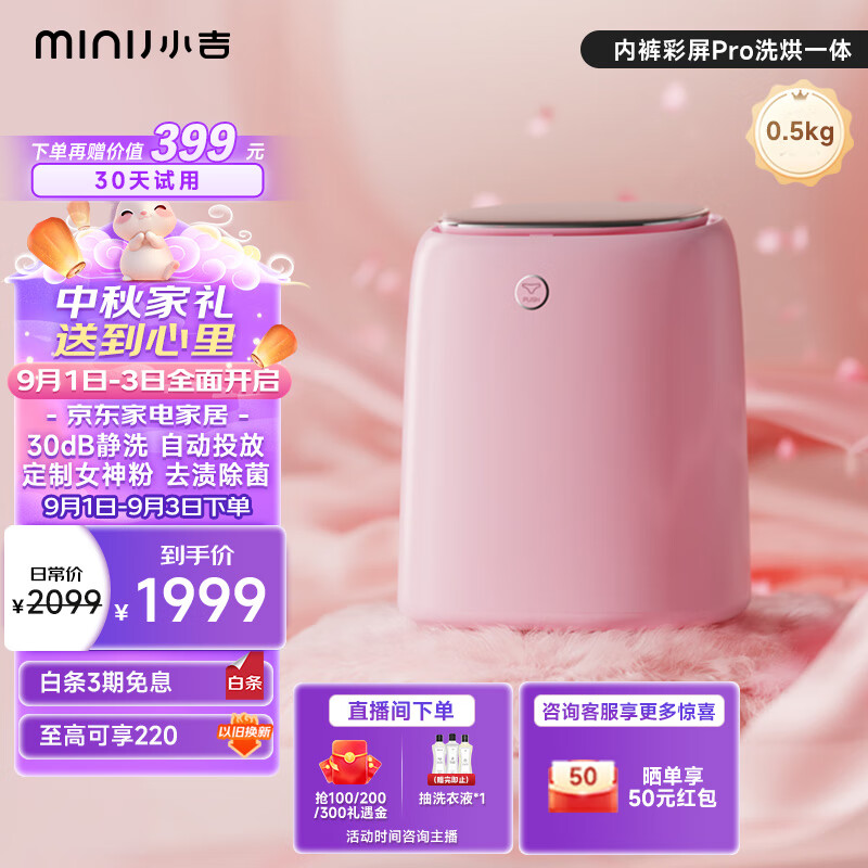 小吉(MINIJ)0.5kg内衣洗衣机小型洗烘一体变频内裤洗衣机粉色女神节礼物U10-PD pro价格:1999.00元!