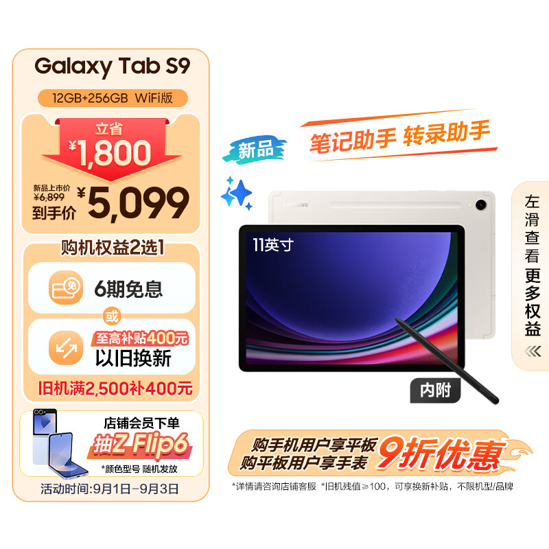 三星(SAMSUNG)S9 Al智享学习办公平板电脑11英寸骁龙8Gen2 120Hz 12G+256G WIFI版含Spen AI平板云雾金价格:5099.00元!