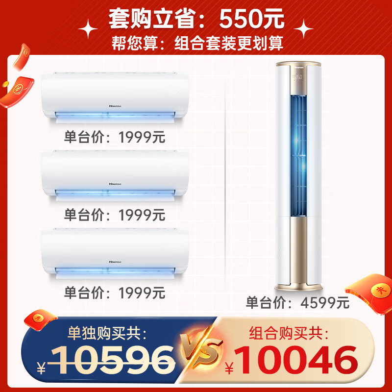 海信(Hisense)易省电空调套装 三室一厅 新一级能效变频超大风量客厅柜机卧室家用挂机(1.5匹*3+大3匹)价格:10046.00元!