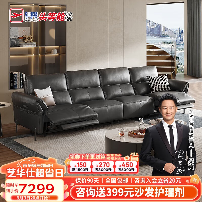 芝华仕(CHEERS)头等舱零靠墙意式轻奢真皮电动功能沙发大户型客厅50795四人黑价格:7299.00元!