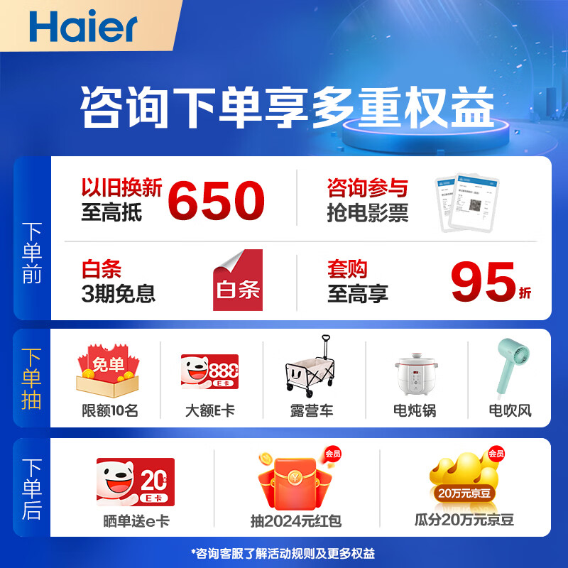 5、双12抢到的,机器非常不错,师傅们上来干活超利索,弄得挺干净的,样子也很满意,价格比较实惠,之前家里就是用的海尔,下回需要还会买!