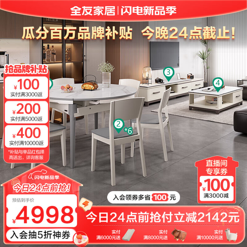 全友家居 现代简约家用客餐厅岩板茶几电视柜一桌六椅组合家具120709价格:7140.00元!