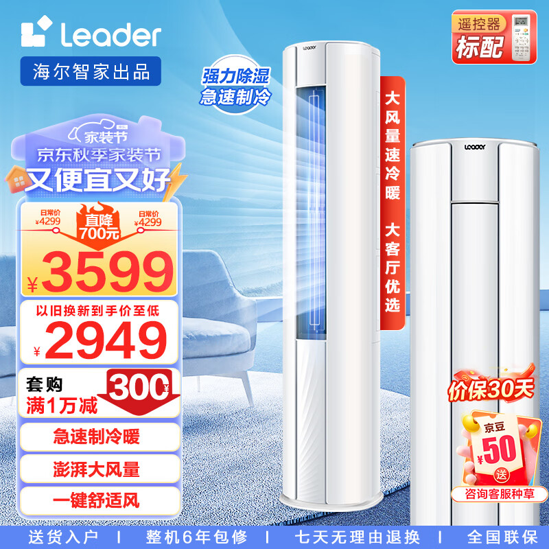 Leader空调海尔智家出品 超省电3匹新能效 立式客厅变频空调柜机 自清洁 KFR-72LW/83@T-Xc 以旧换新价格:3599.00元!