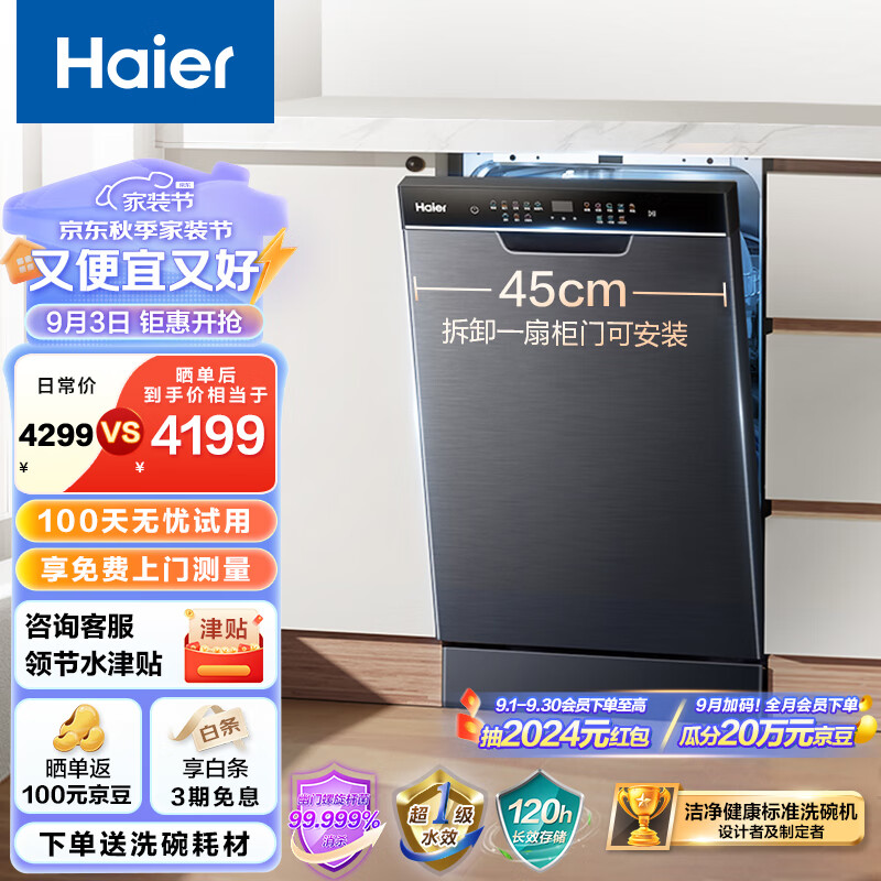 海尔(Haier)12套嵌入式洗碗机小蛮腰X3000 45cm超窄 80℃消杀 变频一级水效 分区洗 EYBW122286BKU1价格:4199.00元!
