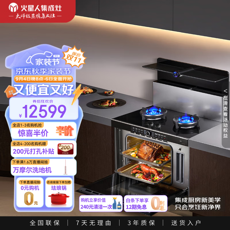 火星人集成灶T70BC 集成灶一体式 爆炒23风量大吸力抽油烟机 集成蒸烤箱一体机 5.2kW燃气灶天然气价格:13149.00元!