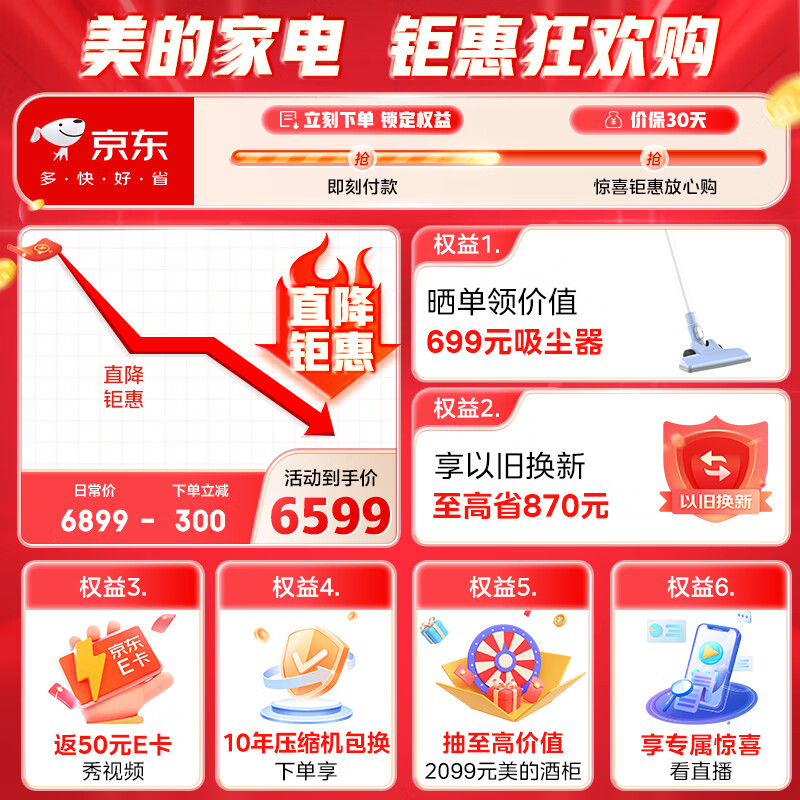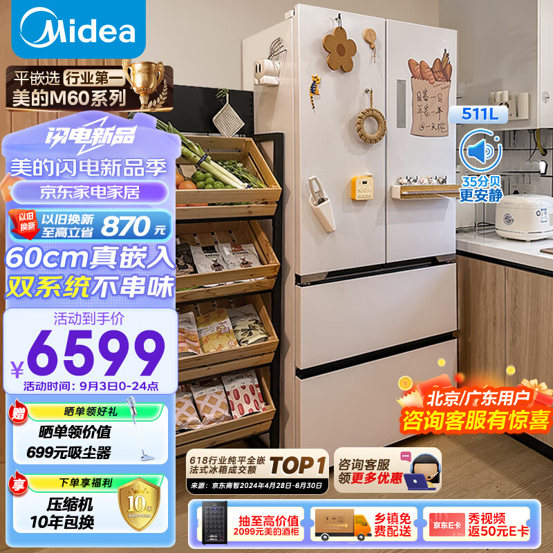 美的(Midea)M60大白豚536法式多门四开门家用冰箱超薄纯平全嵌无霜双系统双循环大容量底部散热MR-536WUFPZE价格:6899.00元!