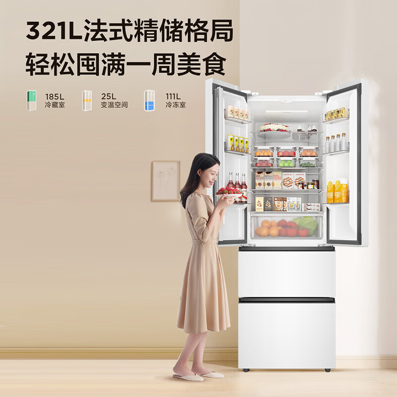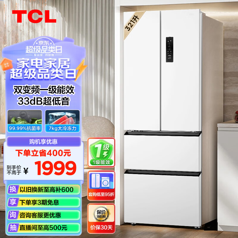 TCL 321升法式四开门多门白色冰箱一级能效33分贝低音风冷无霜智慧变温超薄家用电冰箱R321V5-D象牙白价格:1999.00元!