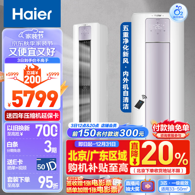 海尔(Haier)新一级能效 3匹 雷神者II 变频冷暖 客厅空调立式柜机 新风空调 KFR-72LW/28LBC81U1 以旧换新价格:5799.00元!