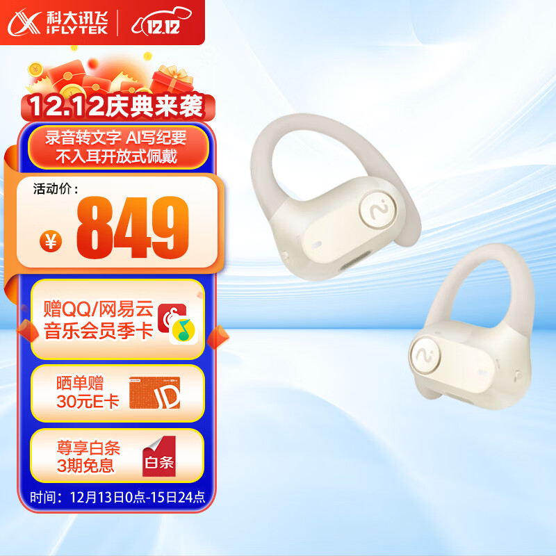 科大讯飞开放式办公耳机 Air 白 无线蓝牙耳机 骨传导升级气传导运动录音耳机 同传听译 适用苹果华为价格:959.00元!