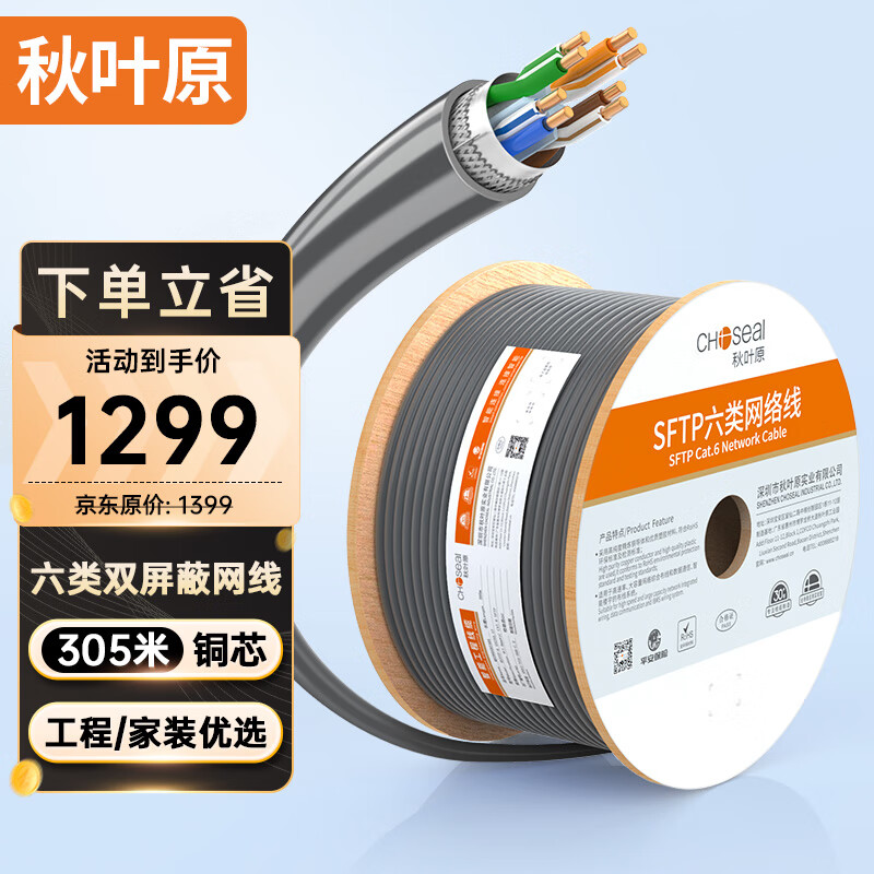 秋叶原(CHOSEAL)六类双屏蔽网线【商用版】CAT6类千兆抗干扰铜线工程家装箱线灰色305米 QS2605AT305价格:1299.00元!