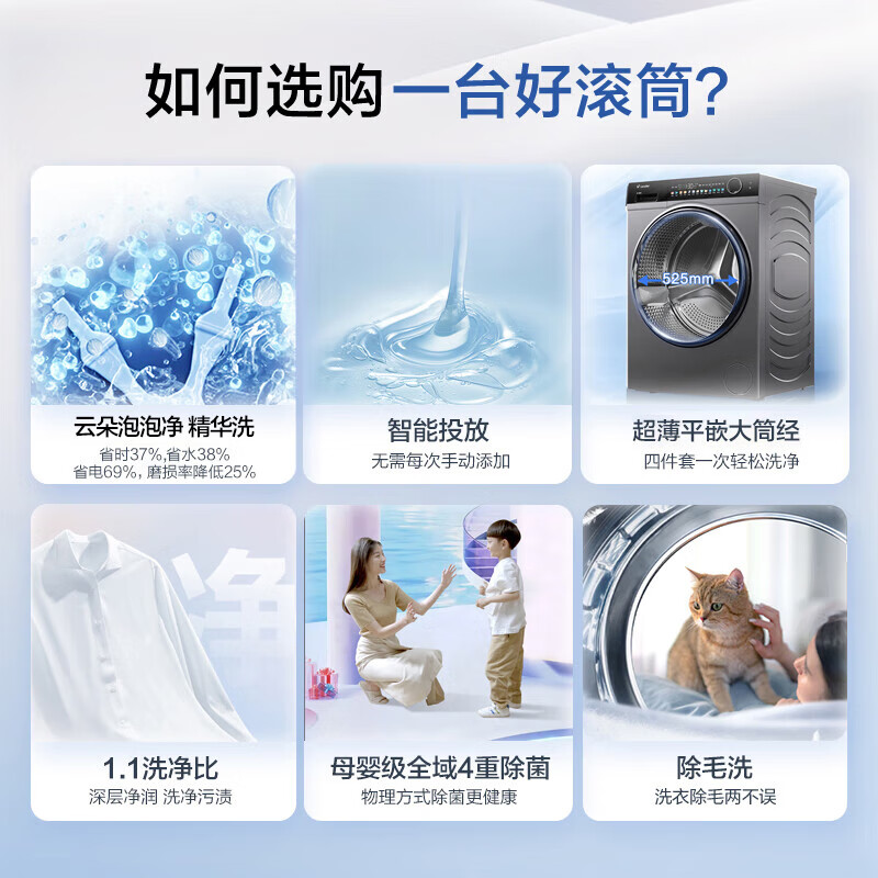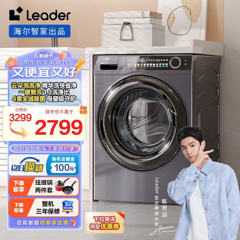 Leader海尔智家出品滚筒洗衣机全自动10公斤家用大容量以旧换新超薄全嵌1.1洗净比+云朵泡泡净@G10BD56S价格:2799.00元!