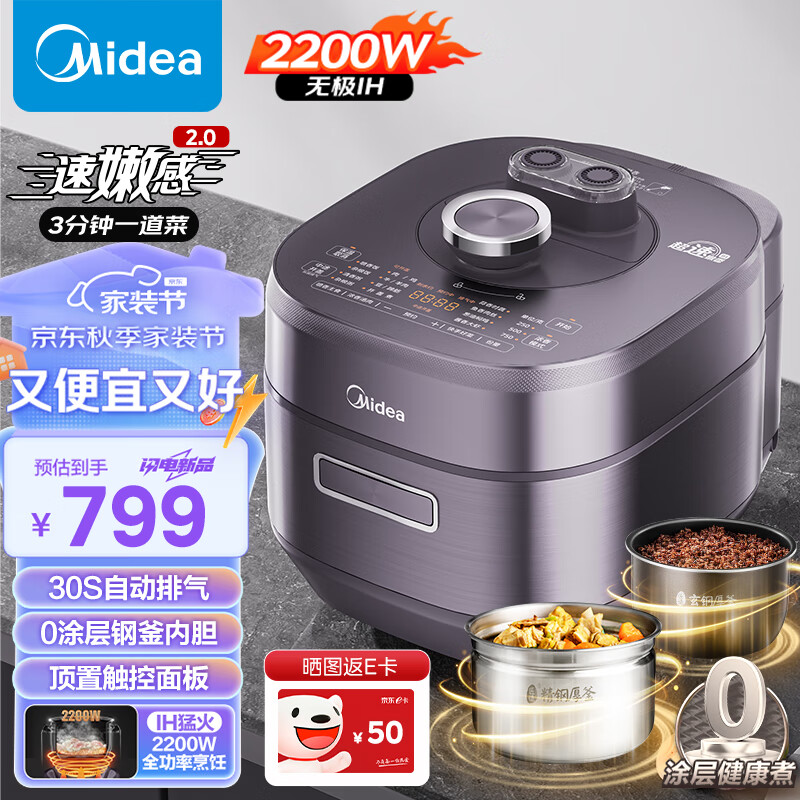 美的(Midea)电锅IH速嫩感2.0电高压锅家用5升高压饭煲顶置触控自动排气双钢胆MY-S5972K价格:799.00元!