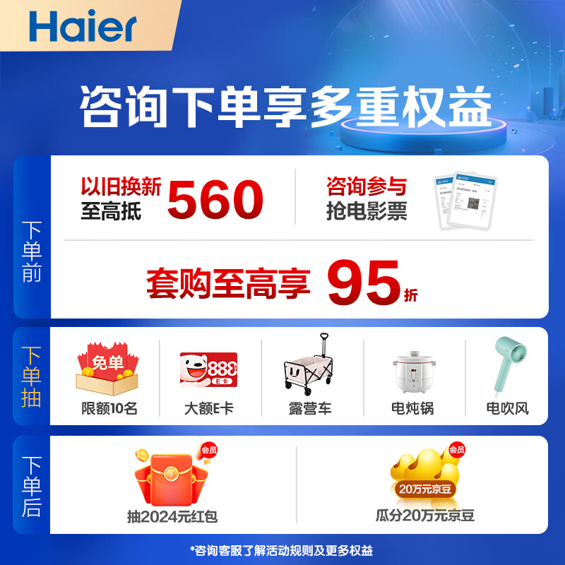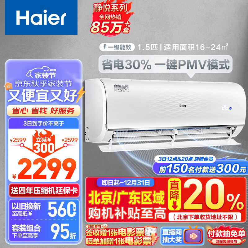 海尔 静悦1.5匹 新一级能效 变频 冷暖 卧室 壁挂式空调 挂机 节能省电 KFR-35GW/01KGC81U1以旧换新价格:2299.00元!