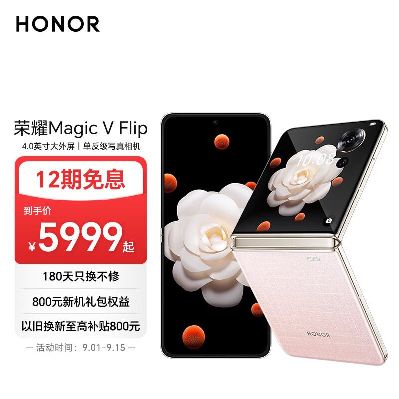 荣耀Magic V Flip 新款小折叠屏 4.0英寸大外屏 单反级写真相机 12+1TB 香槟粉 拍照 5G AI智能手机价格:5999.00元!