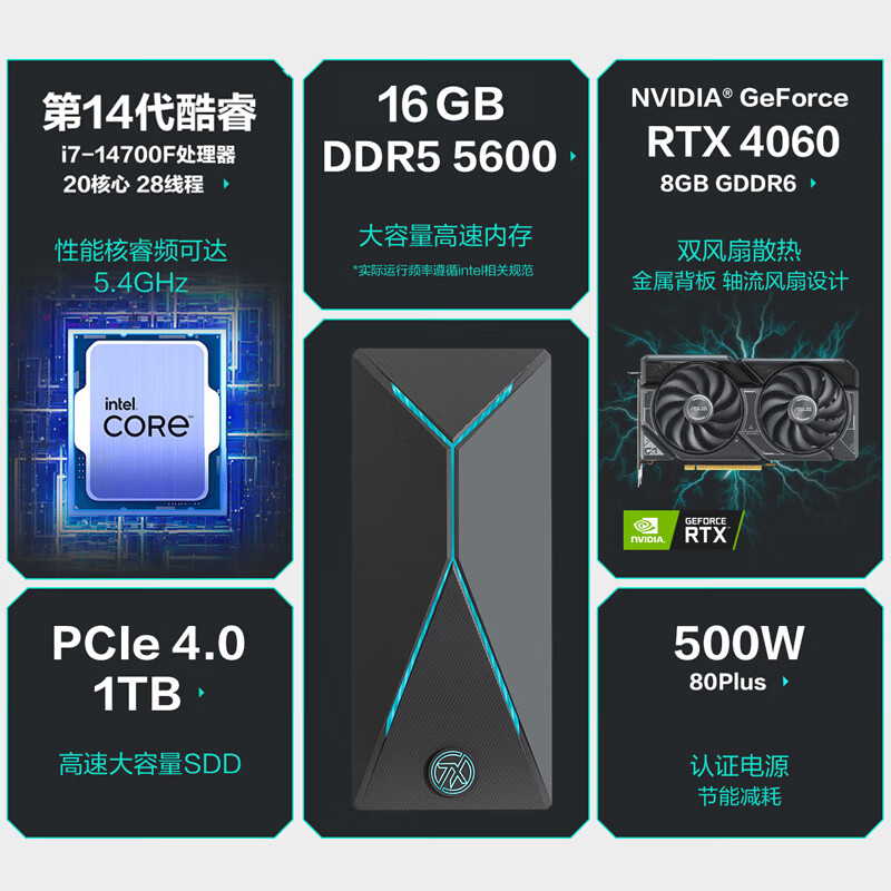 华硕天选X 2024 游戏台式机电脑主机 畅玩黑悟空(14代i7-14700F 华硕RTX4060 8G显卡 16G DDR5 1T)价格:7499.00元!