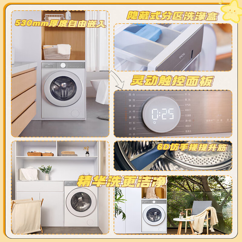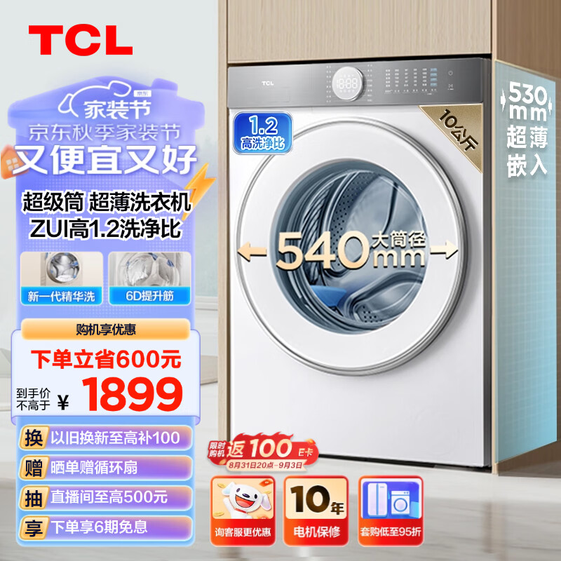 TCL 10公斤超级筒T7H超薄滚筒洗衣机 1.2洗净比 精华洗 540mm大筒径 以旧换新 送装一体G100T7H-D价格:2099.00元!