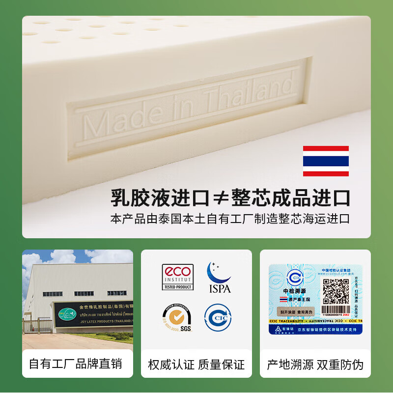 3、老婆有失眠的毛病,在外面民宿睡过金橡树的乳胶床垫后对那感觉就念念不忘,为了能睡个好觉要求家里也换上乳胶床垫,对比了多个品牌,还是金橡树性价比高,而且质量值得信赖,于是双十二立马买了这款泰国原产整芯进口纯乳胶床垫回来铺在旧床垫上,没有异味真的很舒服,店家还送了两个乳胶枕头和一个U型枕也很不错,友情提示大家一定要送货到家,厚的床垫不要用胶的重量来衡量,真的好沉!