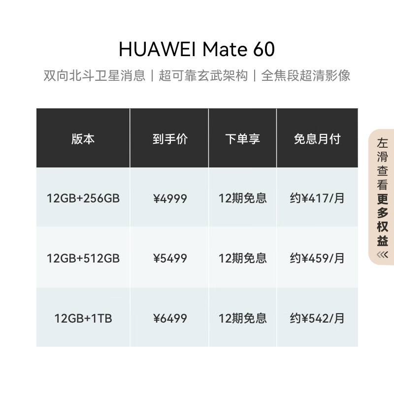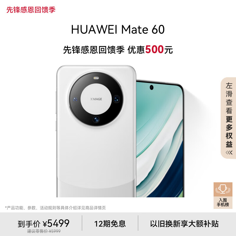 华为(HUAWEI)旗舰手机 Mate 60 12GB+512GB 白沙银价格:5499.00元!