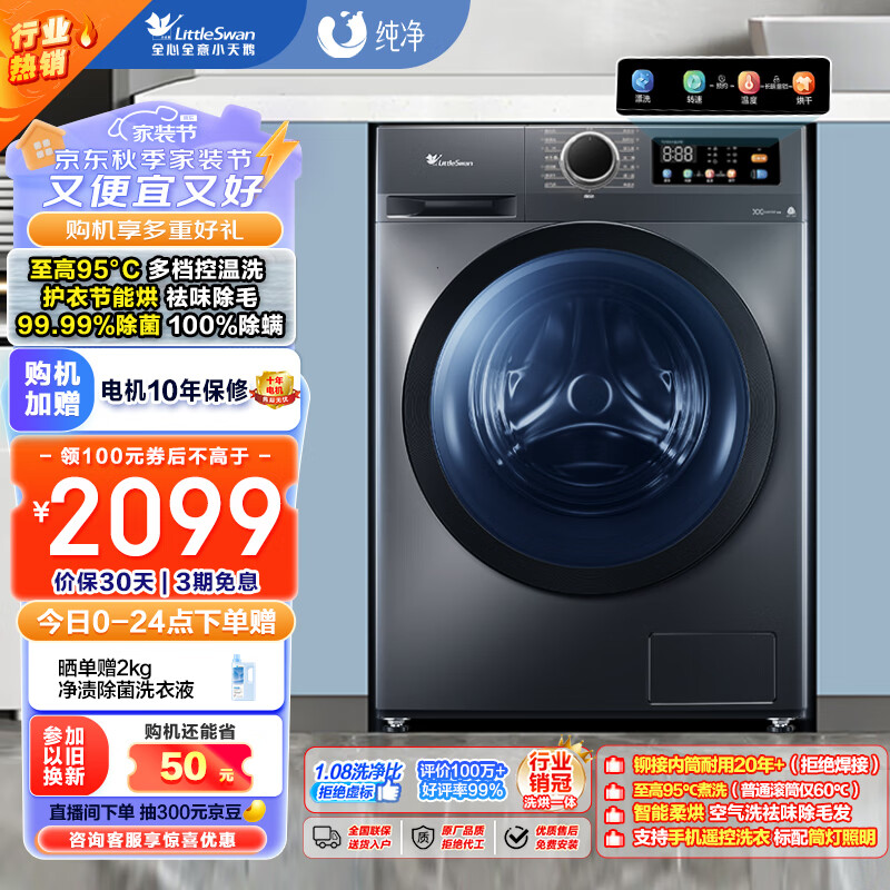 小天鹅(LittleSwan)滚筒洗衣机全自动家用 带烘干洗烘一体【TD100APURE】超薄机身 10公斤大容量 排名前十名 以旧换新价格:2199.00元!