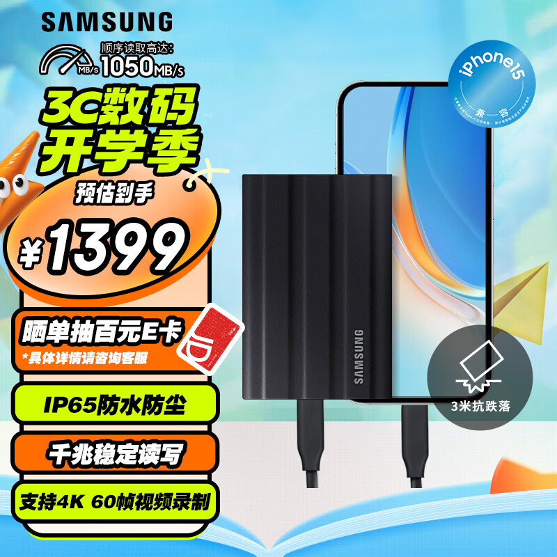三星(SAMSUNG)2TB Type-c接口 移动固态硬盘 T7 Shield 暗夜黑 NVMe读速1050MB/s 手机直连笔记本外接 三防保护价格:1399.00元!