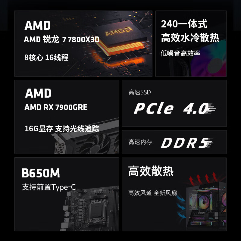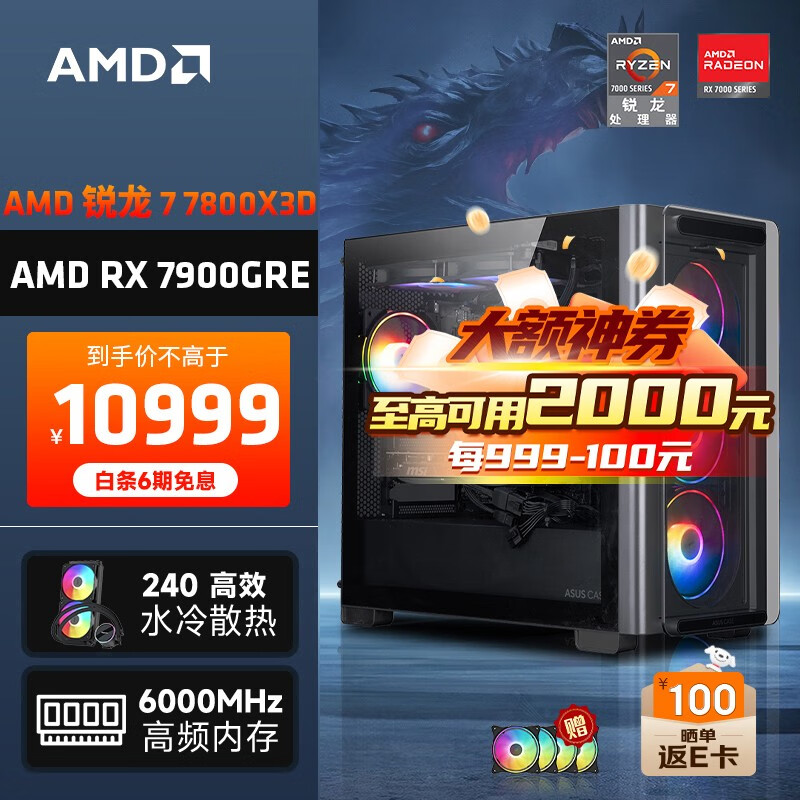 AMD龙神 锐龙R7 7800x3D/RX7900GRE 16G/16G 6000MHz/1T SSD电竞游戏设计师台式电脑主机diy组装整机价格:11799.00元!