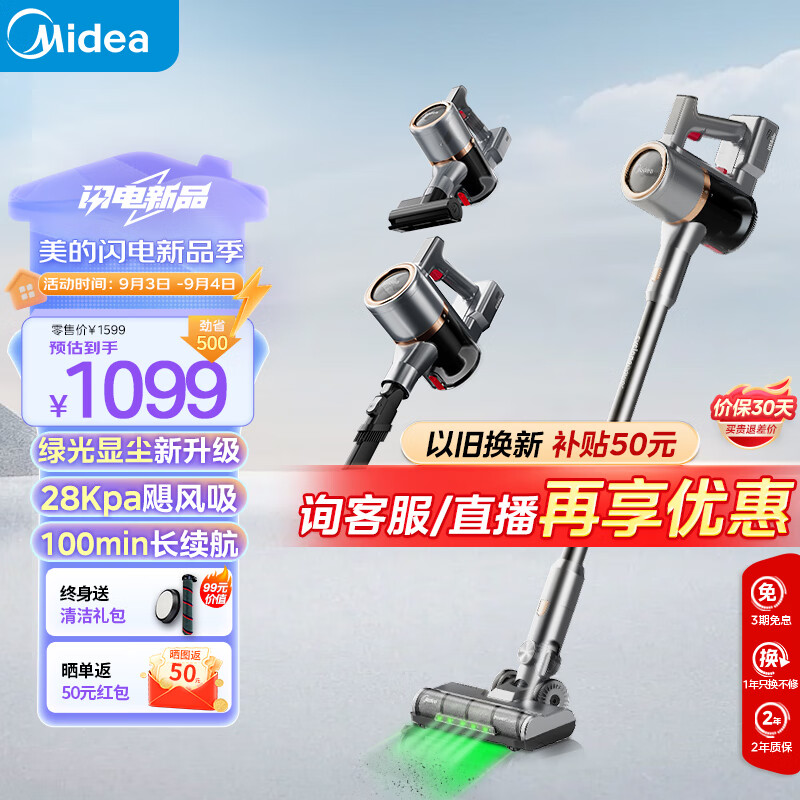 美的(Midea)吸尘器家用无线Q7 手持 吸拖一体 绿光显尘车载大吸力 除螨除尘一体机 轻量价格:1099.00元!